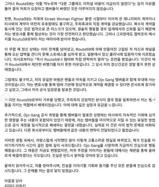 입장문에서 이부키는 공연 주최사 루트59와의 갈등을 구체적으로 밝혔습니다.
